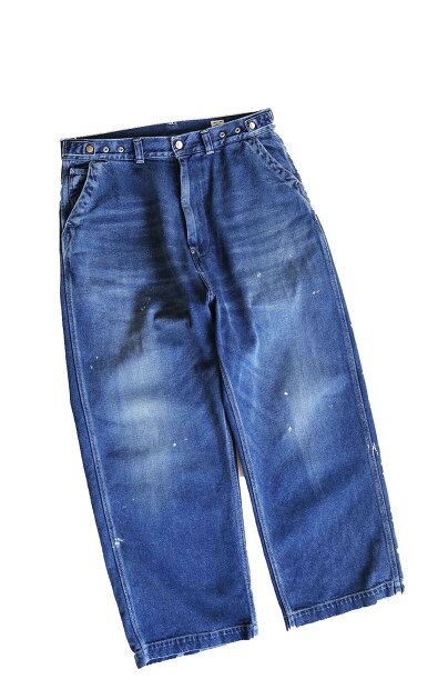 こちらはOrdinary fitsのBell Pants OFC-P003になります。生地には1980年代のLevisの生地を研究し開発した10.5オンスのデニム生地に、熟練の職人による加工を施したものを使用。綺麗なブルーの奥行のある色に適度にペンキを散らしたセンスの良いデニム生地になります。デザインはオーバーオールの上半分をとったようなイメージでシルエットはかなりゆったりとし、ウエストはアジャスターにより調節が可能。デニムの産地として世界的に高い評価を得ている岡山の児島を拠点とするブランドならではの生産力に、どこか東京を感じさせる見栄を張らず、やり過ぎない洗練されたに仕上がっております。是非お試し下さい。