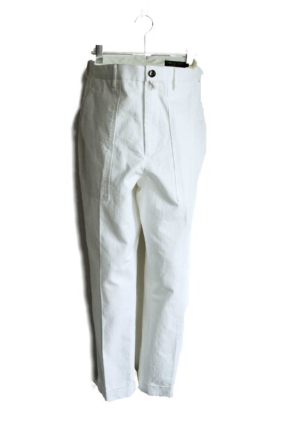 こちらはBarnstormer ドレスファティーグ 1333Pになります。生地には1940年代にUSミリタリー等で使用されていた当時のヘリンボーン生地を研究しドビー織機にて再現したものを使用。ヘリンボーン特有の(ニシンの骨)のような縦模様の陰影が特徴的な奥行きのある表情に、穿き込んでいくうちに味わい深い経年変化をする非常に魅力的な生地になります。デザインはUSミリタリーのファティーグパンツをモチーフにした前身頃の大きめのポケットとヒップにはフラップポケットを配し、前立てにはスラックスによく見られるテングのデザイン仕様により、お腹部分をスッキリと見せ美しいラインを演出。更にフロントボタン下にはピンループを配し、ベルト着用時にバックルのピンをループに通す事により、ベルトをした際の特有のシワやズレを軽減。また内装に関しましてはマーベルトにはしっかりとした芯の入っているタック入りを採用。シャツやティーシャツをインした際に出づらいのはもちろん着用時のストレスを軽減し、前立て裏の布を股下の十字部分にまで伸ばし強度面を考慮。更にBarnstormerならではの卓越したプレスワークにより生み出される綺麗なカーブは、極上のシルエットを生み出し見る者の目を奪います。生地はいわゆるアメカジ感ある無骨な雰囲気ですが、デザインはミリタリーをベースしながらも、各所に仕立て屋ならではの哲学と高い技術を盛り込んだ、男っぽくも繊細且つ洗練されたパンツとなっております。是非お試しください。