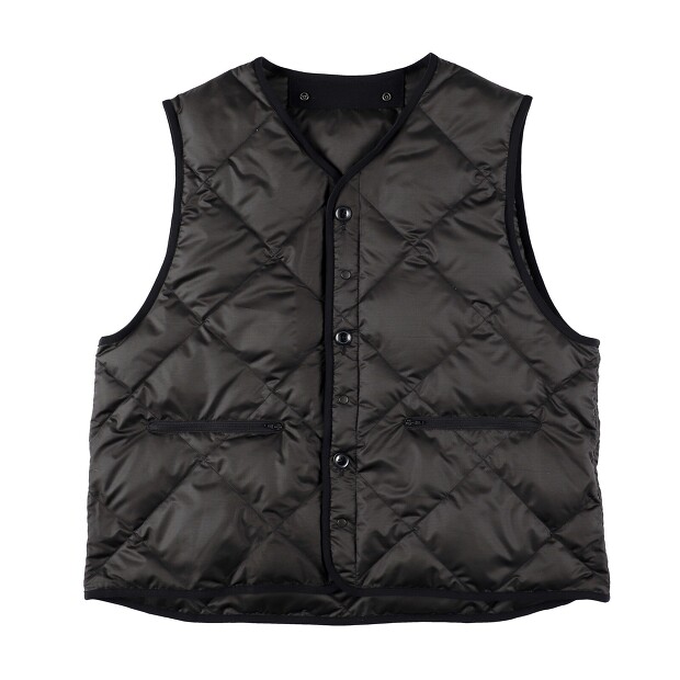 こちらはMODMNT LINER DOWN VESTになります。生地にはマイクロファイバーを使用した高密度織物に撥水加工を施したソフトでしなやかなミニリップストップタフタを使用し、内容物にはスペイン産ホワイトダックを国内洗浄した高品質なダウンを使用。デザインはいわゆるライナーベストな見え方のシンプルなデザイン仕様を採用。単独での着用はもちろんカバーオールジャケットと合体しての着用も可能。