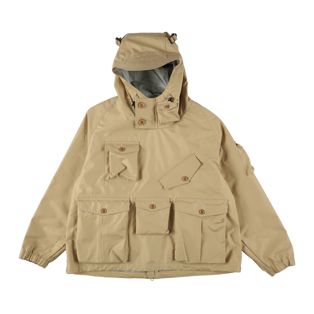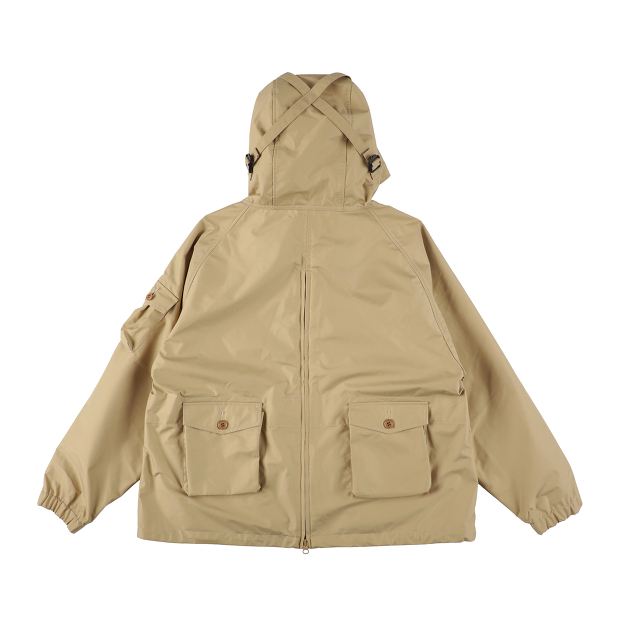 こちらはMODMNT MIL SMOCK SHORTになります。生地には高い撥水性、透湿性を持った3レイヤー高機能生地を使用。デザインは英軍ロイヤルネイビーヴェンタイルスモックをベースに着丈を少し短くし、ポケットデザインをアレンジ。またフード後ろには、同じく英軍ロイヤルネイビーのFOUL WEATHER JACKETのようなクロス状のアジャスターを配し、フード着用時のフィット感を高めると共にデザインアクセントに。