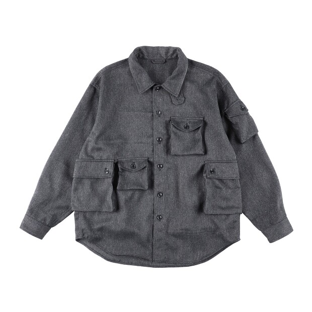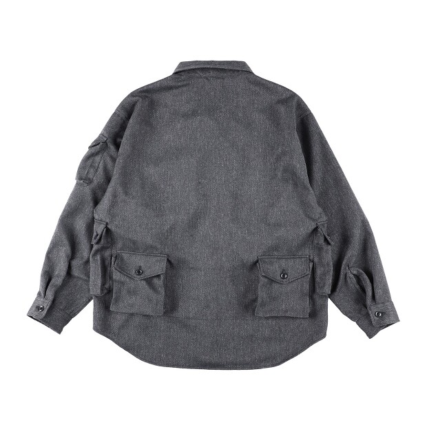 こちらはMODMNT T/TWEED UTILITY CPO SHIRTになります。生地にはレギュラー、カチオン、原着といった3種のポリエステル原料を組み合わせた化繊ながらもツイードのような奥行きのある表情豊かな生地を使用。肌触りも柔らかく見た目もウールのようですが、軽量でチクチク感も無く、防シワ性もあり、ご自宅での洗濯も可能な高機能生地になります。デザインはミリタリーのシャツジャケットをベースに様々な形状のポケットを配し、機能面はもちろんデザイン性も兼ね備えたデザイン仕様を採用。