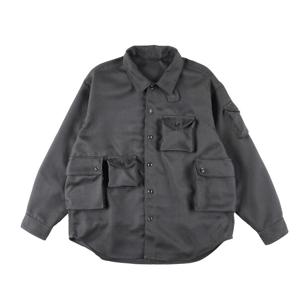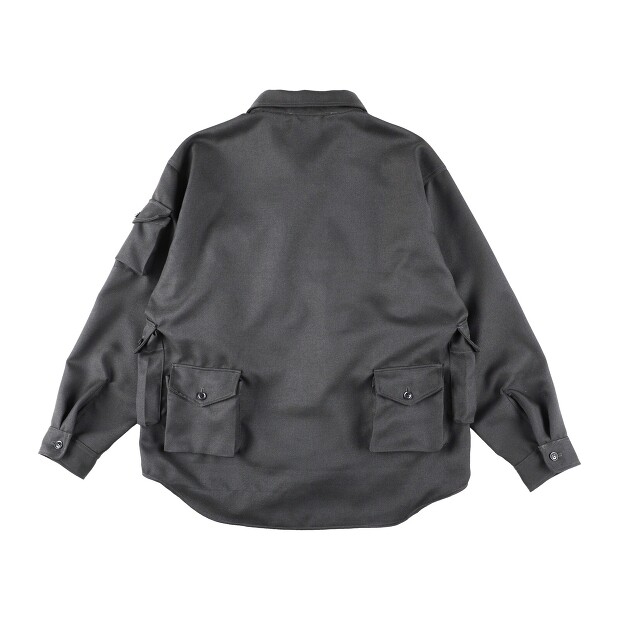 こちらはMODMNT T/TWEED UTILITY CPO SHIRTになります。生地にはレギュラー、カチオン、原着といった3種のポリエステル原料を組み合わせた化繊ながらもツイードのような奥行きのある表情豊かな生地を使用。肌触りも柔らかく見た目もウールのようですが、軽量でチクチク感も無く、防シワ性もあり、ご自宅での洗濯も可能な高機能生地になります。デザインはミリタリーのシャツジャケットをベースに様々な形状のポケットを配し、機能面はもちろんデザイン性も兼ね備えたデザイン仕様を採用。