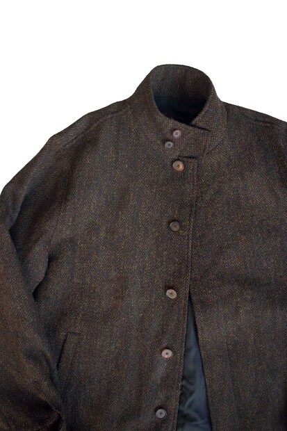 デザインはバラクータのG4をベースに襟はドッグイヤー、前身頃は比翼仕立てにボタンは水牛ボタンを使用。肩はやや落ち気味のスプリットラグランを採用する事により、クラシックな見え方ながらも動きやすく、袖はG4同様にシャツカフス仕様にし、裾もG4同様にリブ無しの仕様ですが直線では無く緩くラウンドした丸みのあるシルエットに。また裏地には表地の雰囲気を壊さない様にイギリス製のデッドストック生地をチョイスし、更にテーラード工房にて50年以上のキャリアを持つ熟練の職人が裁断から縫製まで一人で行う丸縫いにて製作。一般的な大量生産の工場では真似できないテーラード工房ならではの、立体的で包み込まれるような極上の着心地のジャケットに仕上がっております。