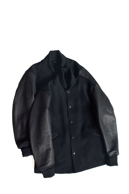 こちらはA VONTADE AWARD JACKET VTD-0558-JKになります。身頃にリサイクルウールながら高級素材であるSUPER 100’sと同等の繊維調を持つ羊毛を使用した二重織メルトン地を使用。メルトンとは思えないくらい軽量で柔らかく滑らかな肌触りながらも、しっかりと保温性のある生地になります。デザインは70年代のアワードジャケットをベースにウールのニットショールカラーにリブカフス、また裾にはリブが無く袖とポケットのレザーはシボ感を残した国産オリジナルカウレザーを使用。よくあるガチガチの硬いレザーでは無く、最初から馴染みの良い着心地のものを使用。デザイン的にはアワードジャケットですが、配色のラインを排除し全体を黒に統一する事によりスポーティーな雰囲気を軽減。デニムやチノはもちろんですが、スラックス等とも相性が良さそうな、男っぽくも洗練されたA VONTADEならではのジャケットに仕上がっております。是非お試しください。