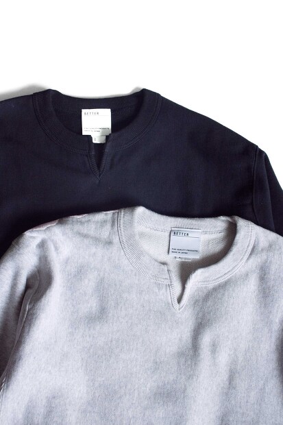 こちらはBETTER VINTAGE FLEECE KEY NECK PULLOVER BTR2525になります。生地には空紡糸を使用したコットン100%の裏毛素材を使用。適度な肉感、しっかりしたハリ感があり、表面はドライなシャリ感のある手触りが特徴の生地になります。デザインはいわゆるチャンピオンのスウエットをモチーフにシルエットはゆったりとし、身頃は生地を横目に使用し、脇をリブ素材で切り替えたリバースウィーブ仕様を採用。また袖口のリブは折り返して着用できるよう長めに設定。更に首元はセンターに切り込みを入れたキーネックデザインを採用しアクセントに。単なるチャンピオンのレプリカに終わらない、『やり過ぎず、やらな過ぎず』のBETTERらしい味付けのスウエットに仕上がっております。是非お試しください。