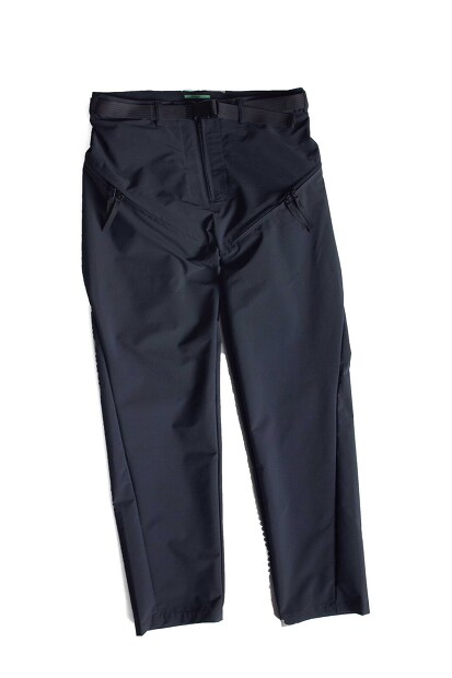 こちらはCCP ACCORDION PANTS PT-NB112 になります。生地にはテイジンが開発したSOLOTEXを使用。高密度に織ったしっかりとした生地感にドライな肌触り、更に防風、撥水性のある生地になります。デザインはウエストに着脱可能なベルトを、腿両サイドにはヒップに向かって斜めに入ったジップポケットを配し、ポケット内部に玉縁ポケットを装備。またサイドシームは捻じれて立体的なシルエットを形成。更に後ろ腰部分には、ツナギ服の腰の部分に見られる蛇腹のプリーツを配し機能的且つデザインのアクセントに。全体的にバイアスに入ったポケットやシームの見え方に、ワークウェアでお馴染みのツナギ服のデザインを採用した、CCPならではの独創的なパンツを是非お試しください。
