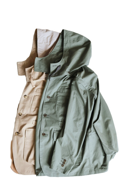 こちらはMODMNT TRAVEL JACKETになります。生地には経緯に強化糸を格子状に織り込んだリップストップ生地を使用。軽量で耐久性がありながらもコットン特有のナチュラルな風合いが特徴の生地になります。デザインは70年代にイタリアのBRIONIがアメリカのTWA航空の為に特別にデザインしたトラベルジャケットをソースに、前身頃には様々な形状のポケットを配し、背中には着脱可能なハンティングポケット、また首周りのフードと袖も着脱可能となっており、様々なスタイルやシチュエーションに対応可能。オリジナルの単なる焼き直しではない、都会的な大人の男のシティーラギッドウェアを是非お試し下しさい。