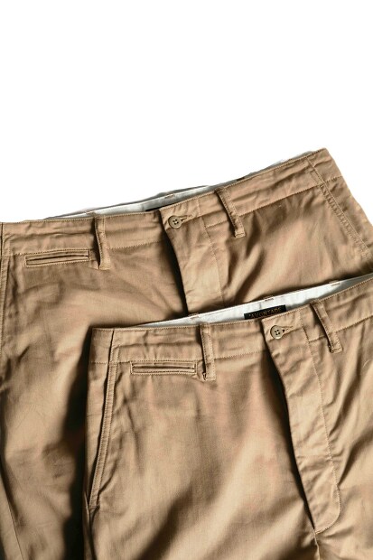 こちらはA VONTADE TYPE 45 CHINO TROUSERS VTD-0340-PT3になります。生地にはコンパクト紡績にて糸毛羽を無くしたムラ糸を高密度に織り上げた後にワッシャー加工を施したチノクロスを使用。しっかりと安心感のあるタフな生地ながらも毛羽の少ない滑らかな表面が特徴の生地になります。デザインは1940年代のアメリカ軍のチノパン、いわゆる45KHAKIをベースにデザイン。右前に両玉縁のコインポケット、ヒップポケットは本来玉縁ポケットですがフラップポケットにアレンジ。また各所の縫製はダブルステッチではなく、あえて割り縫いにて縫製。またシルエットは本来の太さを残しつつ軽くテーパードをかけアップデート。ミリタリー特有の無骨さは残しつつも、適度に洗練されたA VONTADEらしいバランス感のチノパンに仕上がっております。ベーシックなチノパンをお探しの方には自信を持ってお薦めしますので是非お試しください。