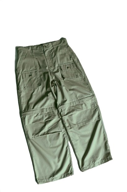 こちらはMODMNT KNOCK ABOUT PANTSになります。生地には経緯に強化糸を格子状に織り込んだリップストップ生地を使用。軽量で耐久性がありながらもコットン特有のナチュラルな風合いが特徴の生地になります。デザインはUS ARMY FATIGUE PANTSをベースに、前身頃の大きめのパッチポケットの上にフラップポケットを配した面白いデザイン仕様を採用。また全体的にゆったりとし軽くテーパードがかったシルエットに、ウエストはイージー仕様を採用し、膝部分にはUS ARMY M65 CARGOの様なアクションプリーツを配し、裾にはドローコードを配しシルエットの調整が可能。更にこのパンツの一番の特徴であるシップによる着脱によりショーツとしても履ける2WAYデザインを採用と、様々なミリタリーの要素を上手くブレンドしたMODMNTらしいアメカジ感ある機能的なパンツに仕上がっております。是非お試しください。