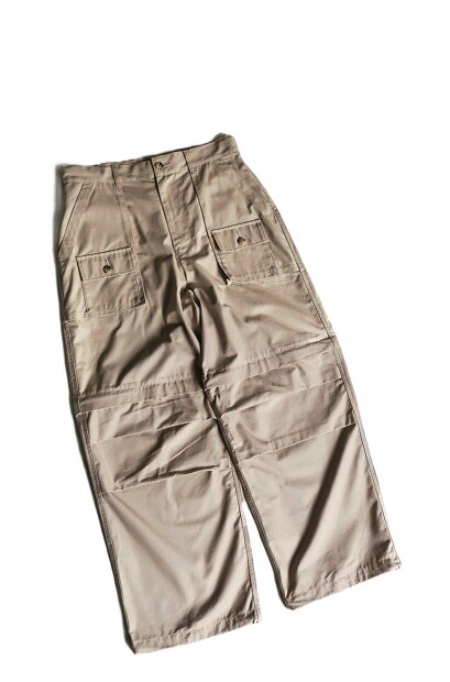 こちらはMODMNT KNOCK ABOUT PANTSになります。生地には経緯に強化糸を格子状に織り込んだリップストップ生地を使用。軽量で耐久性がありながらもコットン特有のナチュラルな風合いが特徴の生地になります。デザインはUS ARMY FATIGUE PANTSをベースに、前身頃の大きめのパッチポケットの上にフラップポケットを配した面白いデザイン仕様を採用。また全体的にゆったりとし軽くテーパードがかったシルエットに、ウエストはイージー仕様を採用し、膝部分にはUS ARMY M65 CARGOの様なアクションプリーツを配し、裾にはドローコードを配しシルエットの調整が可能。更にこのパンツの一番の特徴であるシップによる着脱によりショーツとしても履ける2WAYデザインを採用と、様々なミリタリーの要素を上手くブレンドしたMODMNTらしいアメカジ感ある機能的なパンツに仕上がっております。是非お試しください。