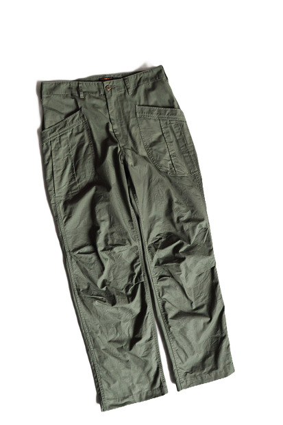 こちらはA VONTADE FATIGUE TROUSERS VER3 VTD0485-PT2になります。生地には今まで使用していたリップストップ生地よりも少し太めの糸を使用したものを採用。軽く耐久性に優れ通常のリップストップよりも、しっかりとした安心感ある手触りが特徴の生地になります、デザインはアメリカのファティーグパンツを独自に解釈し再構築。独特な丸みを帯びたカーゴポケットに、ジップには1940年から1950年の当時のジッパーの規格、製法をそのままに作られているWaldasを採用。またウエストはアジャスターを配しベルトをしなくても着用でき、ヒップにはスナップボタンによるフラップポケットを装備。シルエットはいわゆる極太なものではなく、かといってスッキリさせ過ぎてミリタリー特有の無骨さが全く感じられないヤワな細いものでもない丁度良い絶妙なシルエットに調整。無骨なミリタリーテイストな中にも、独自の解釈により各所に施した機能的且つファッション性のあるデザインにより、今までにない新しいミリタリーパンツに仕上がっております。A VONTADEクラシックの呼び声高いアイテムを是非お試しください。